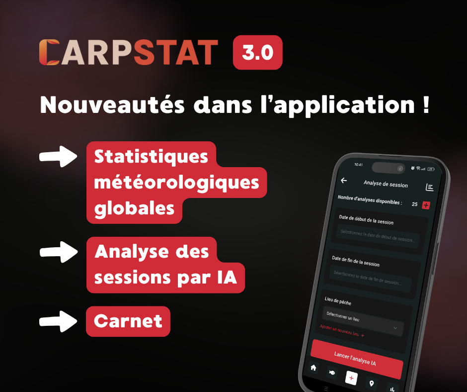 CarpStat est une application mobile gratuite pour les pêcheurs. Elle te permet d’enregistrer facilement tes prises, d’ajouter des photos, des postes et des appâts. L’application complète automatiquement les données météo et génère des statistiques qui aident à planifier tes prochaines sessions de pêche.